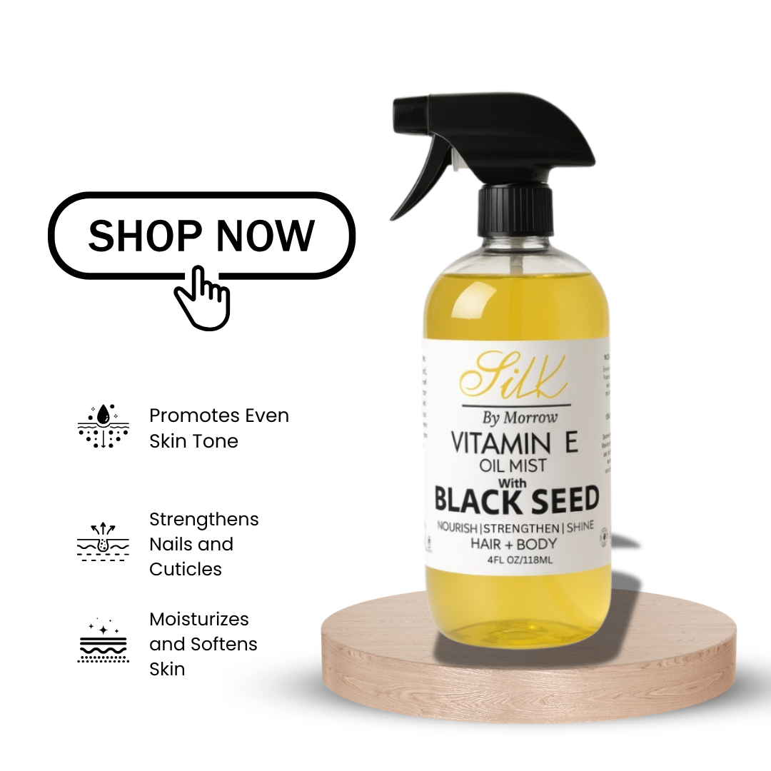 Our Vitamin E Oil Mist with Black Seed restores strength, shine, and softness — naturally.